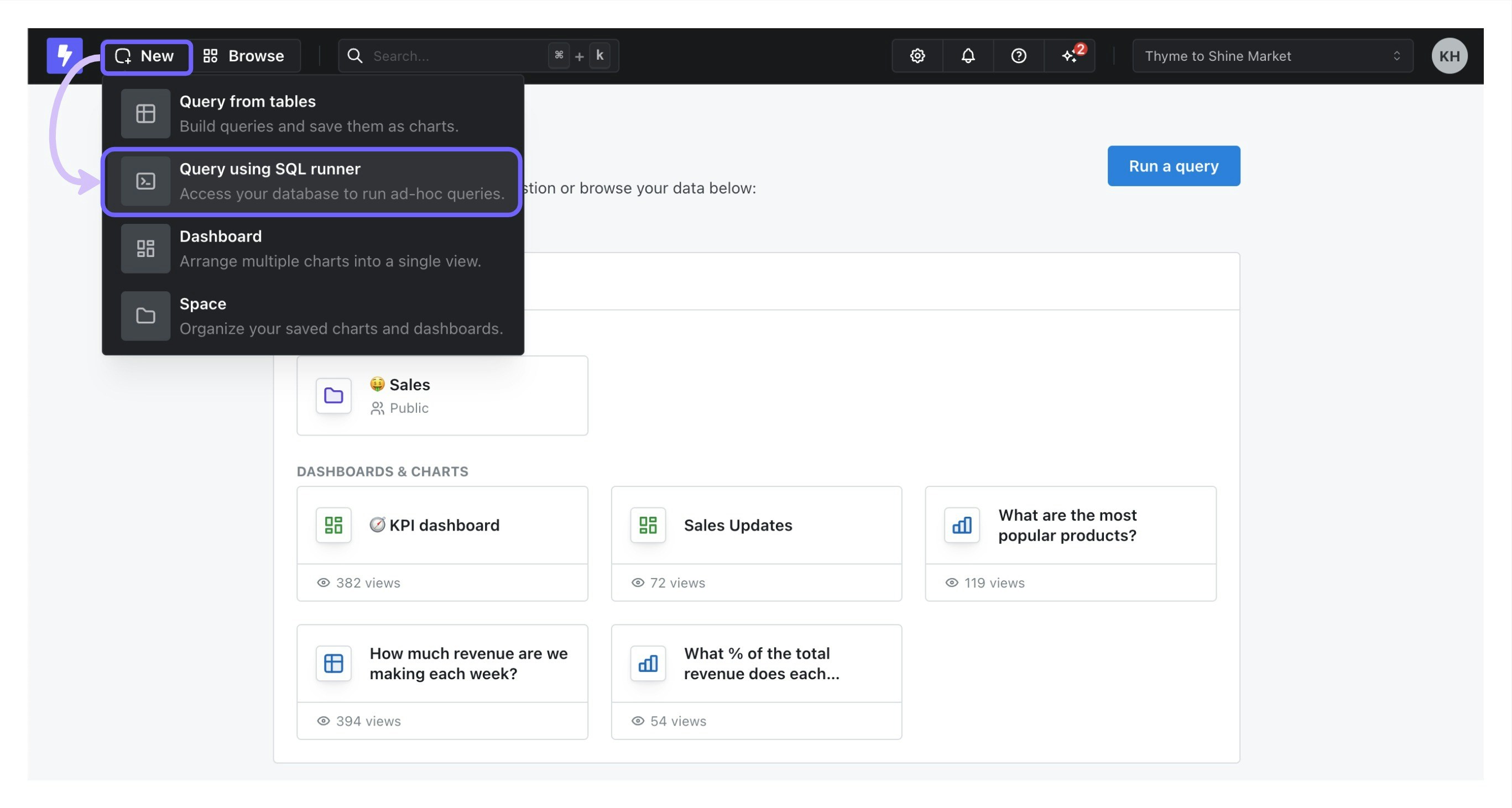 The SQL Runner can be accessed from theNew —> Query using SQL Runner option in your navigation bar.
