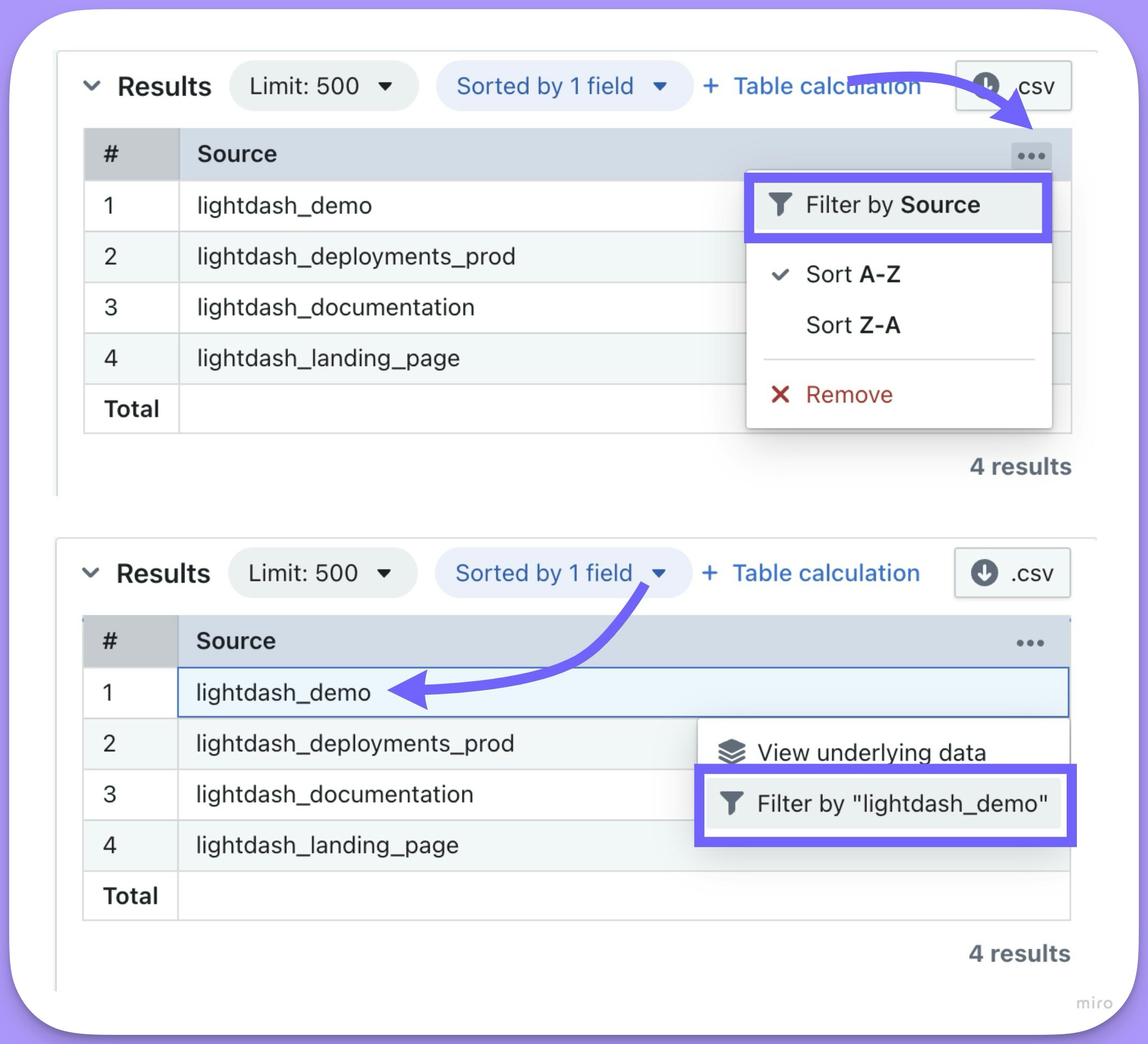 Once you have some results in your results table, you can add filters by clicking on the three-dot menu of the column you want to filter on, or by clicking on the value you want to filter by.